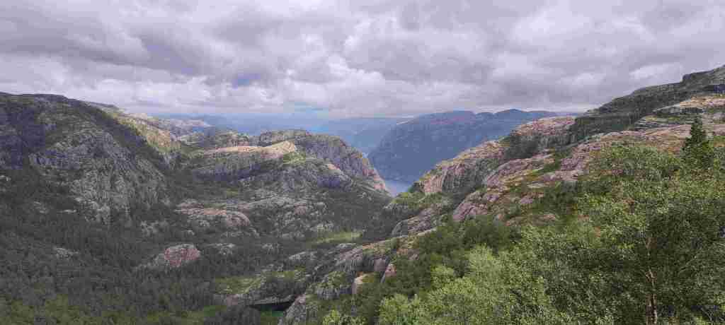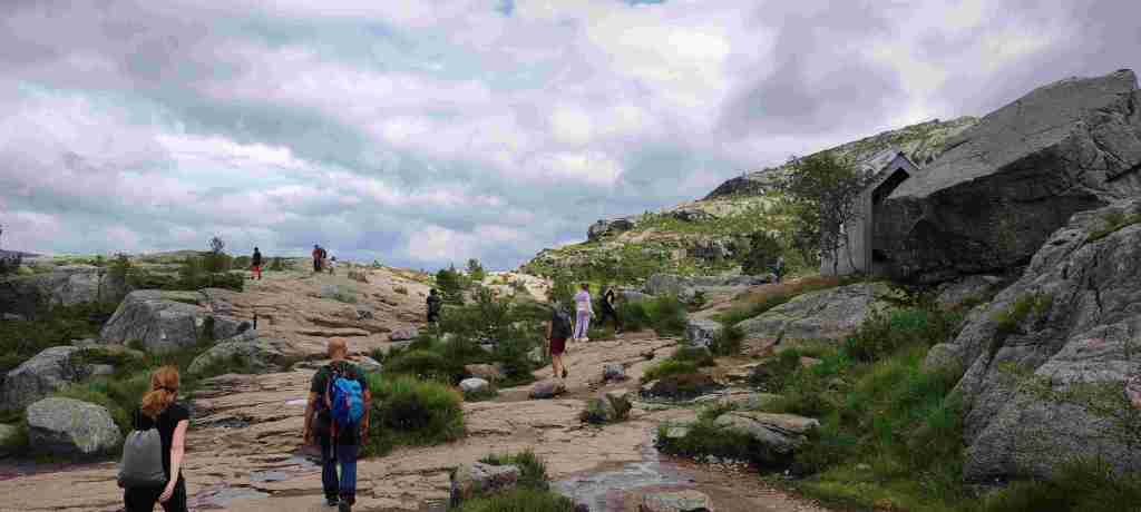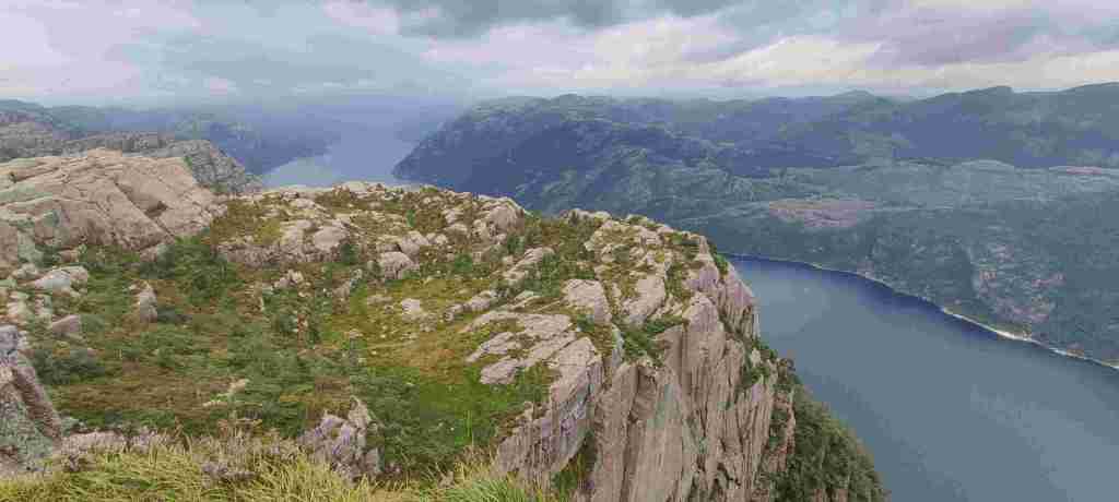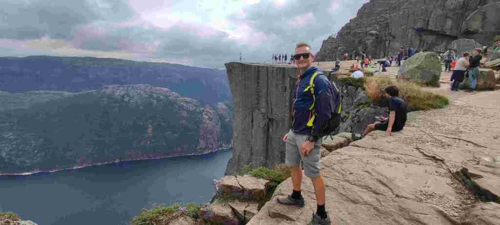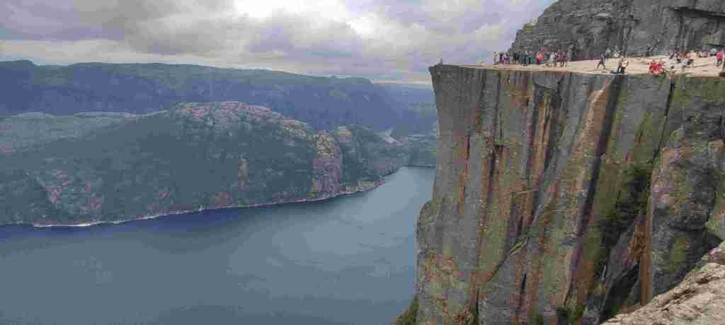 Salimos hacia Preikestolen. Es un negocio grande lo que tienen montado ahí. El aparcamiento vale barato las dos primeras horas, pero no te da tiempo a ir y a volver, y luego ya te cobran el día entero. Pero merece la pena. Es un poco rollo que haya tanta gente, pero el final de la ruta, el púlpito en sí, es brutal. Estas son las fotos: