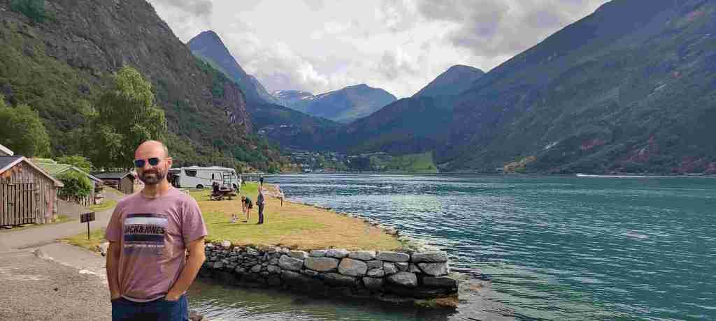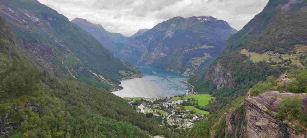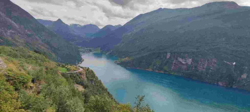 Salimos para Sogndalsfjøra. Tardamos bastante porque paramos en muchos sitios. Nada más empezar el camino hay una zona de zig zags que sube la una montaña: Trollstigen. Es muy chulo y cada poco tiempo parábamos. Y después hay varios miradores con un fiordo precioso (Sunnylvsfjorden) hasta llegar al pueblo en el que empieza el fiordo: Geiranger. El pueblo está abarrotado de gente. Aparcamos en un sitio de media hora, compramos algo de comer y seguimos la ruta hacia delante y paramos en un parque que estaba a 10 minutos o así para comer lo que habíamos comprado (buñuelos de bacalao con puré de patatas, muy bueno).